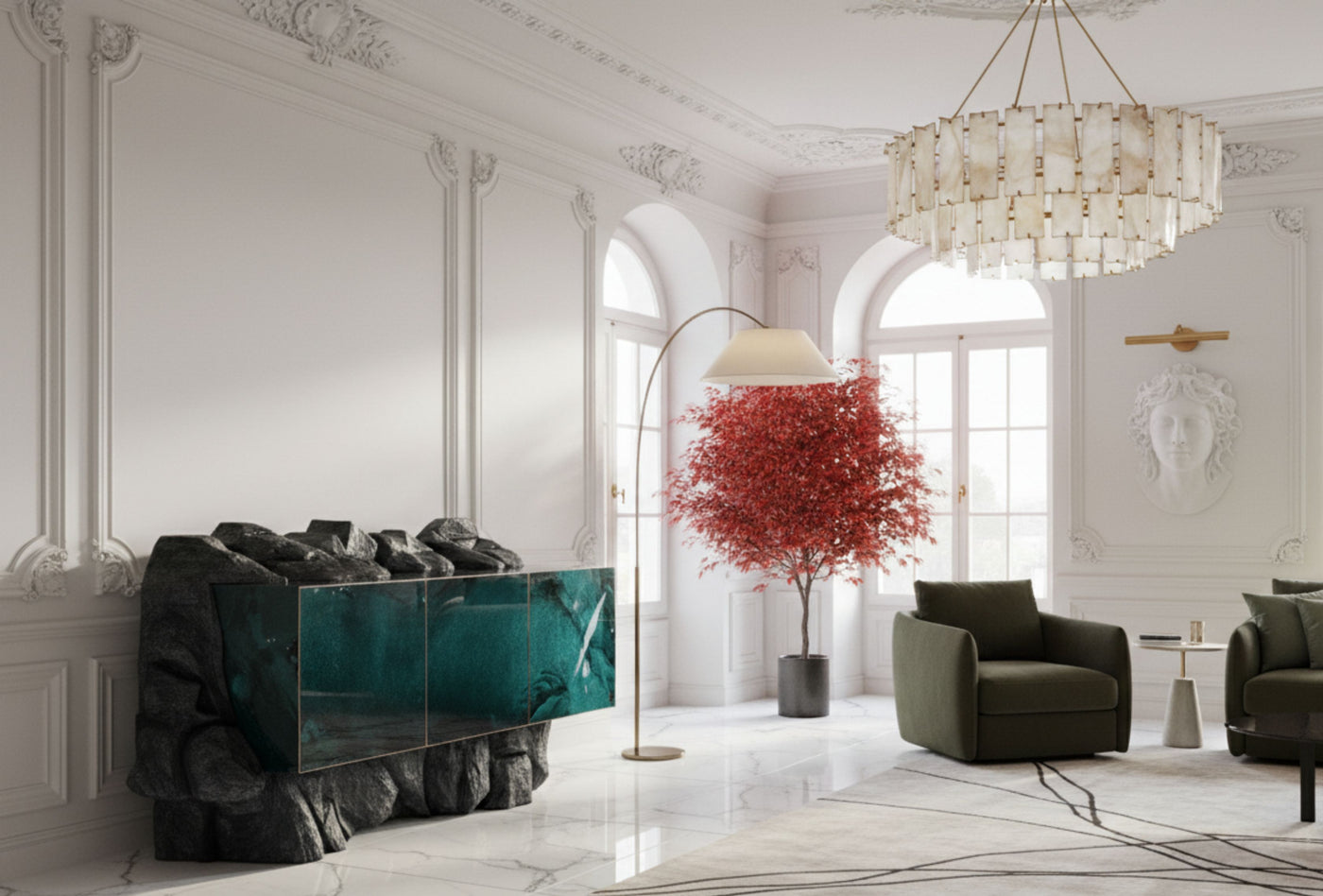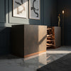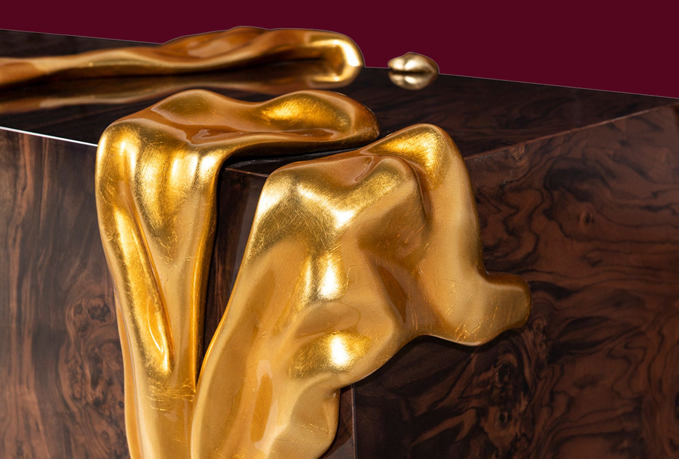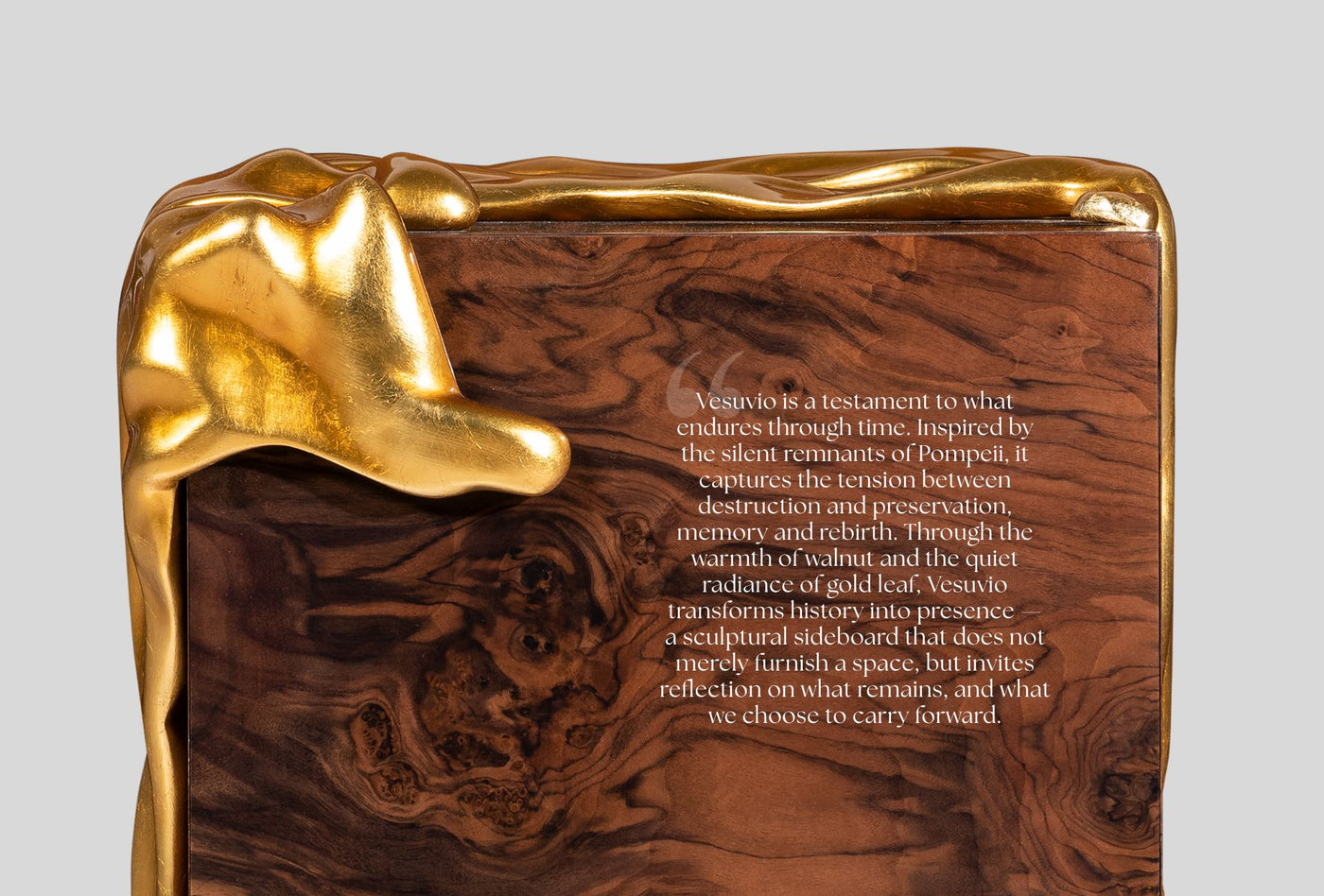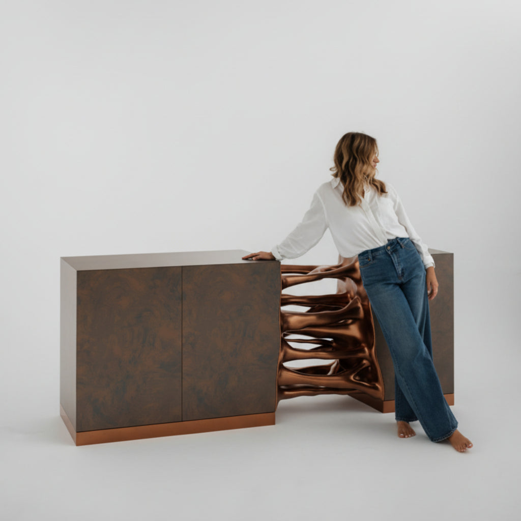 The structure combines the natural refinement of Walnut Wood Veneer with the solidity of Oak Wood, creating a harmonious contrast between tone and texture. Inside, a luminous Copper Leaf Gradient finish unfolds, bringing depth and warmth through its handcrafted reflections. Every curve and surface is executed with meticulous precision, merging organic beauty with structural mastery. The result is a piece that radiates strength, sophistication, and the captivating duality that defines MainGUILTY’s creative DNA.
