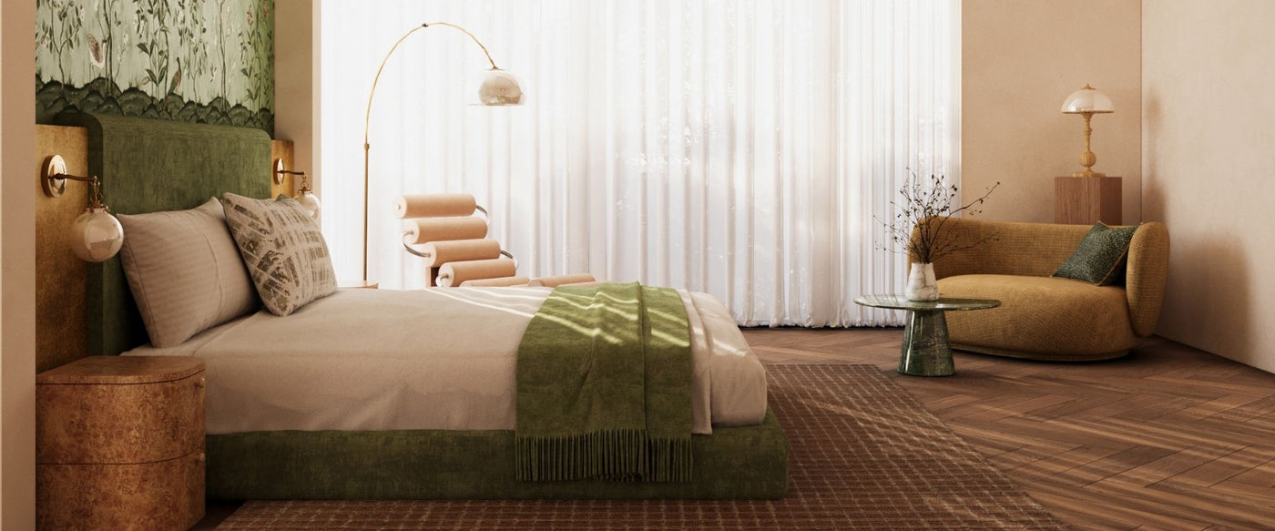 Bathed in natural light and wrapped in refined textures, this bedroom unfolds as a sanctuary of quiet luxury. Soft greens and warm neutrals create a seamless dialogue between nature and craftsmanship, where every element is selected for its presence, never for excess.