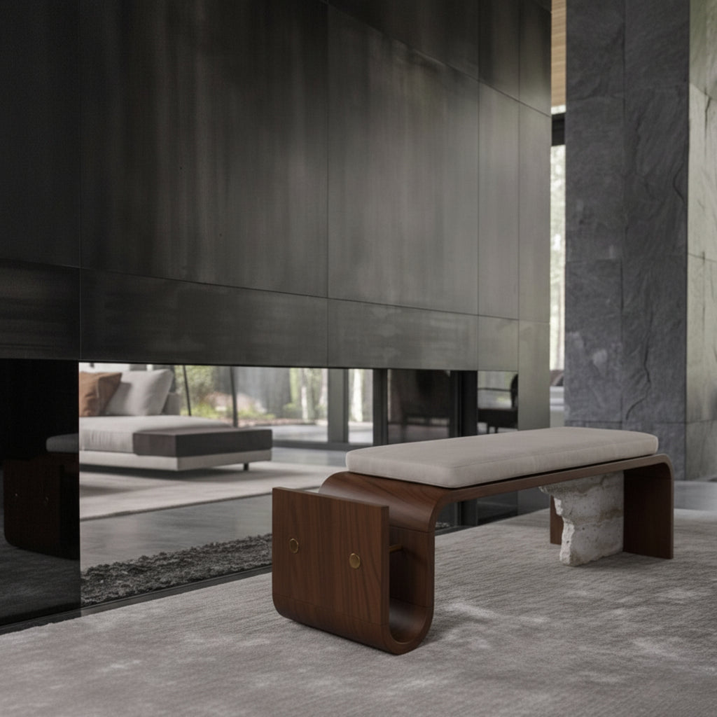 The Break Bench embodies the delicate balance between strength and elegance — a sculptural reflection of tension and release. A slab of Travertine appears to cut through the warm oak wood veneer, creating a visual rupture that speaks to the contrast between nature’s raw essence and human precision. Enhanced by golden stainless steel details, the piece celebrates imperfection as beauty, transforming an act of fracture into a statement of harmony and timeless design.