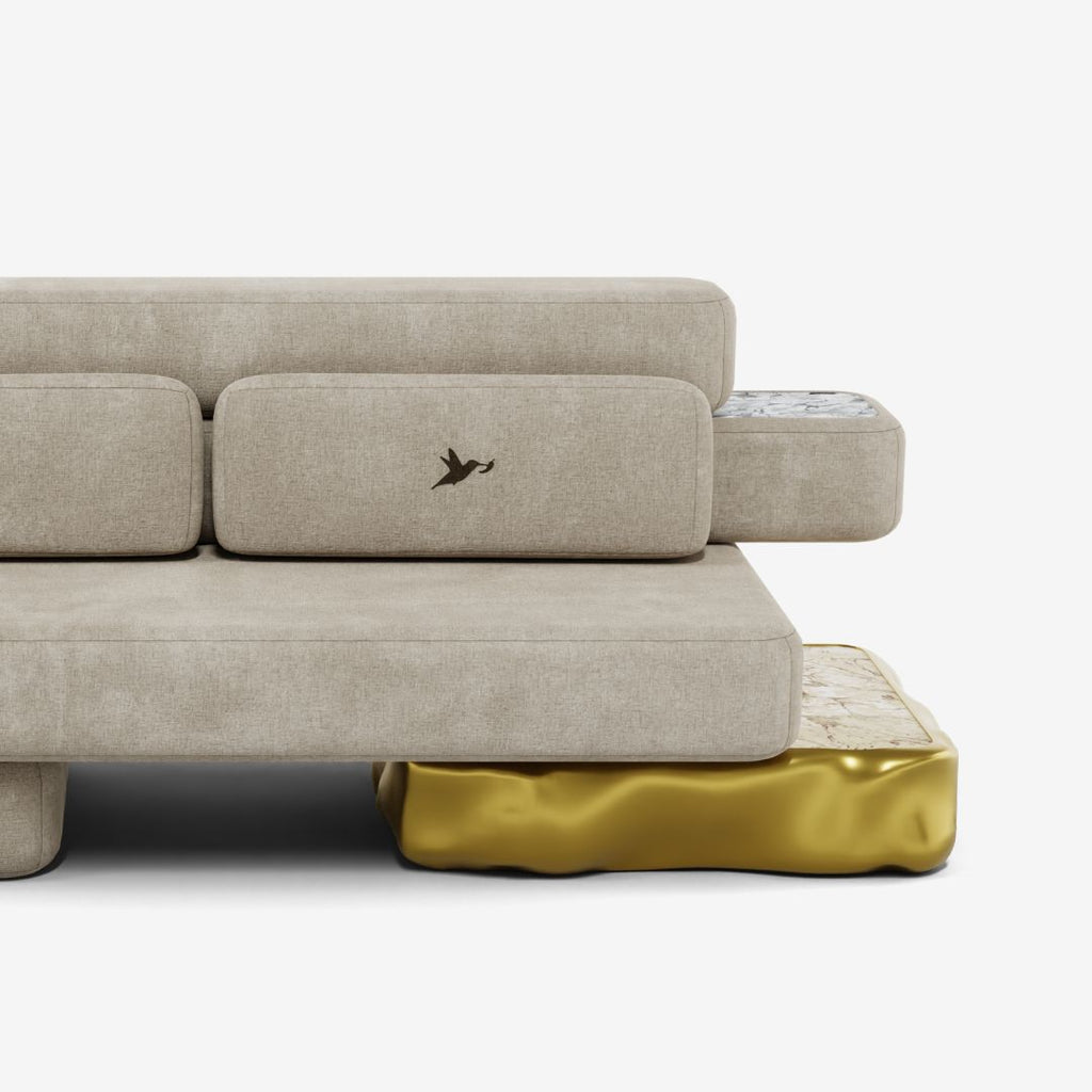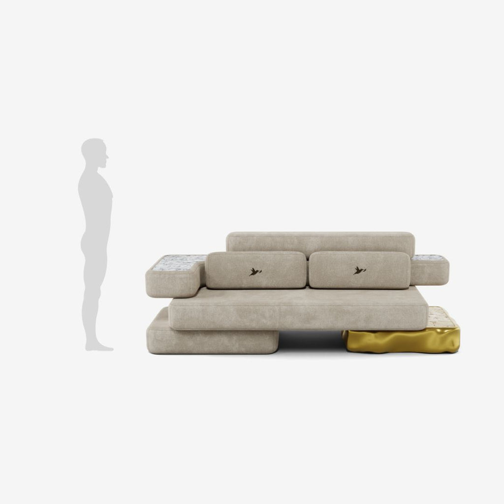 The Strati Small Sofa embodies the harmony between artistic depth and refined comfort. Its layered silhouette draws inspiration from the natural stratification of stone, revealing a dialogue between form and material. The sculptural base, adorned with delicate golden nuances and ceramic-effect marble details, enhances its sense of movement and sophistication.