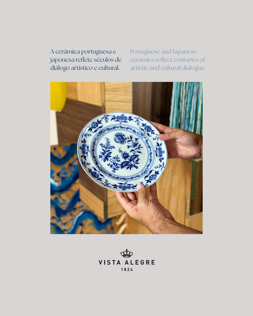 The ceramics on the folding screen combine Portuguese and Japanese traditions, featuring floral patterns and shades of blue that evoke the delicacy and history of both countries. The plate in the work is from Vista Alegre, a symbol of Portuguese porcelain, blending harmoniously with Japanese elements and celebrating the dialogue between cultures and artistic heritage.