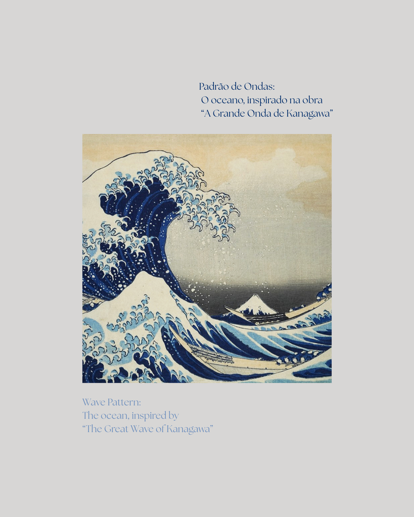 O padrão ondulado do biombo foi pintado à mão pelo criador, usando as tintas da Robbialac, e inspira-se na obra “As Grandes Ondas de Kanagawa”. As ondas representam o movimento do oceano, a força da natureza e a conexão entre culturas, reforçando a temática marítima da peça.
