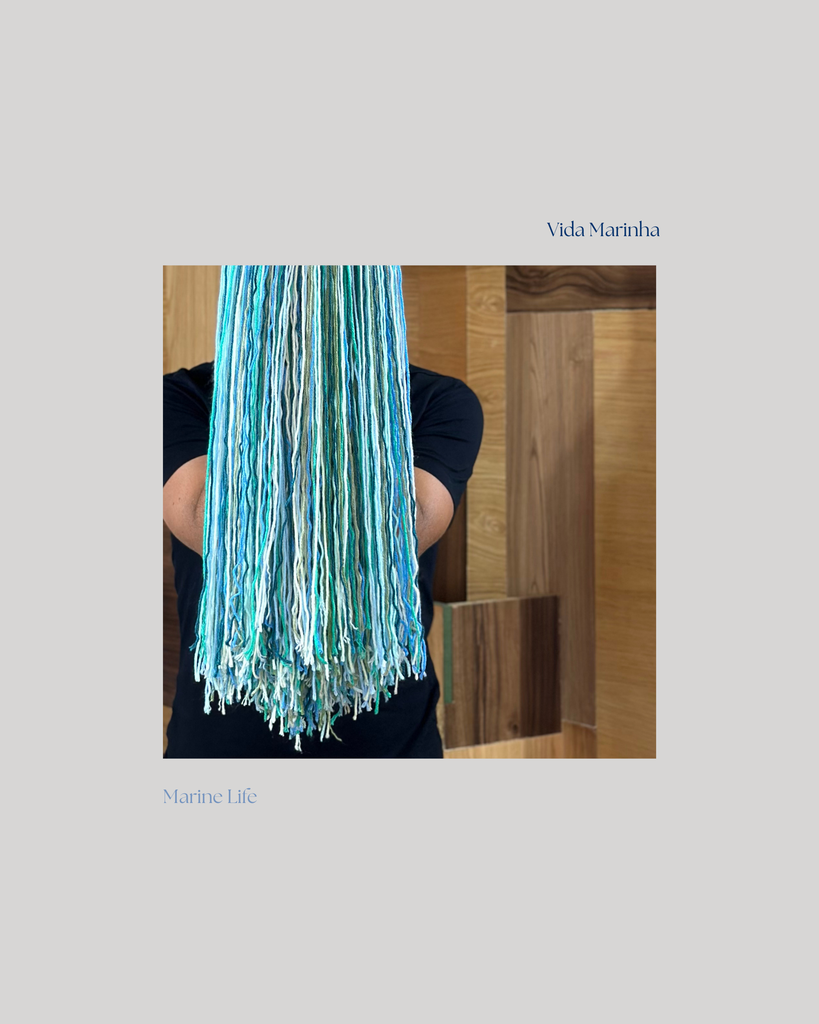 A lã residual, reaproveitada na construção do biombo, representa a vida marinha, evocando texturas e formas do oceano. Os tons de verde e azul reforçam a sensação de água e biodiversidade, enquanto cada fio remete à riqueza e diversidade do mundo subaquático, reforçando o conceito de upcycling e sustentabilidade.